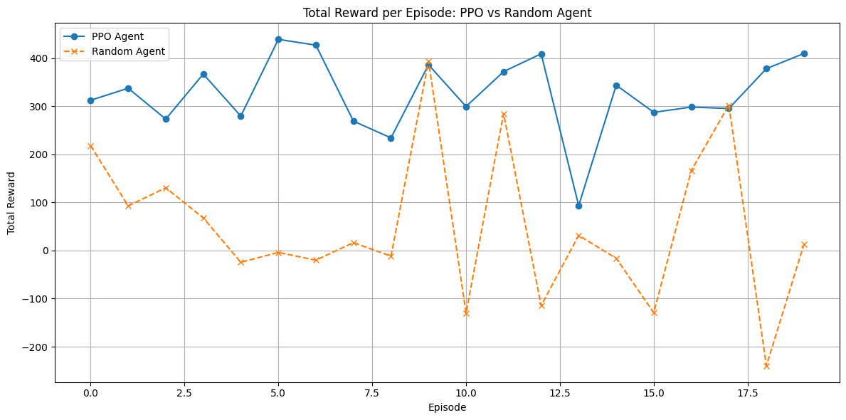 plt.title("Total Reward per Episode: PPO vs Random Agent")
